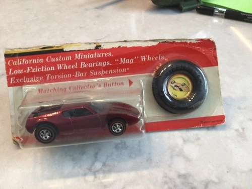 | 1969 HOT WHEELS REDLINE AMX 2 MAGENTA OR ROSE ??? ON PARTIAL CARD WITH BUTTON Sold $275.00