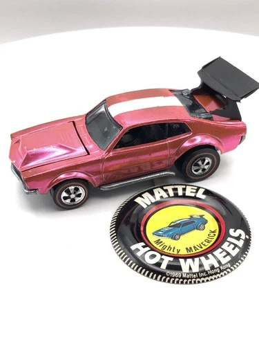 | Hot Wheels Redline Mighty Maverick 1969 Hot Pink Made In U.S.A. W/Button Sold $372.00