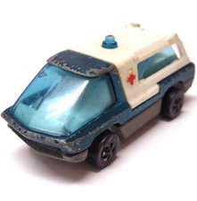 Note: Heavyweights Series. Produced only in Hong Kong. Featured a standard "short bed" frame that was topped by a plastic ambulance cab, and translucent blue roof light.