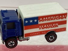 Note: Designed by Larry Wood, and produced in Hong Kong. Blue cab with white plastic cargo box. Red, white and blue tampos on the sides, with "American Hauler."