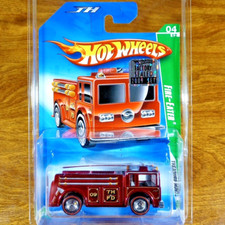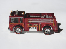 Note: Designed by Larry Wood and produced in Hong Kong. Red body with blue plastic light bar on the roof. Yellow and black fire truck tampos on the sides. Chrome plastic chassis with translucent blue interior.