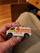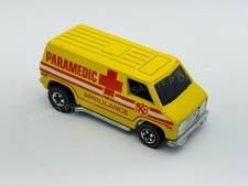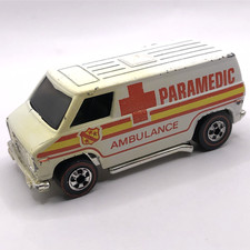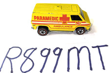 Note: Produced in Hong Kong. Same casting details as the 1975 Paramedic, except the body color has been changed to yellow. Red and white "Paramedic" and "Ambulance" stripe tampo on the sides. Chrome plastic chassis.
