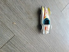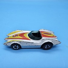 Note: Speed Racer-type body style. White body with red, yellow and purple stripe tamp on the hood and rear deck. Number "5" on the hood. Black plastic chassis, with black plastic interior.