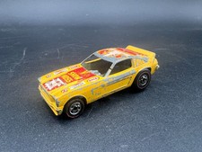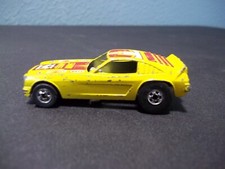 Note: Designed by Larry Wood and produced in Hong Kong. Based on a Mustang II fastback. Bare metal chassis and engine, with a black interior. Yellow body with red and white stripe tampo on the roof, and horse tampo on the hood.